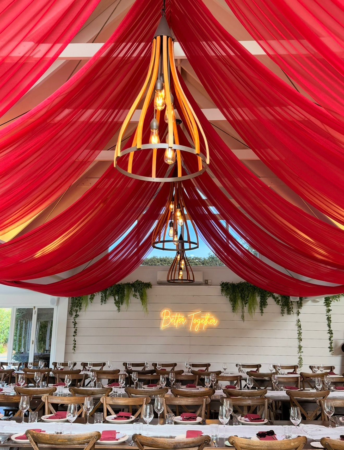 Transform your venue with our luxury ceiling drapes in Auckland, designed to create a soft, romantic, and visually stunning atmosphere. Our ceiling draping installation at Abel Estate elevates the entire space, with flowing fabrics styled across the ceiling to add depth, elegance, and a refined finish to your event.