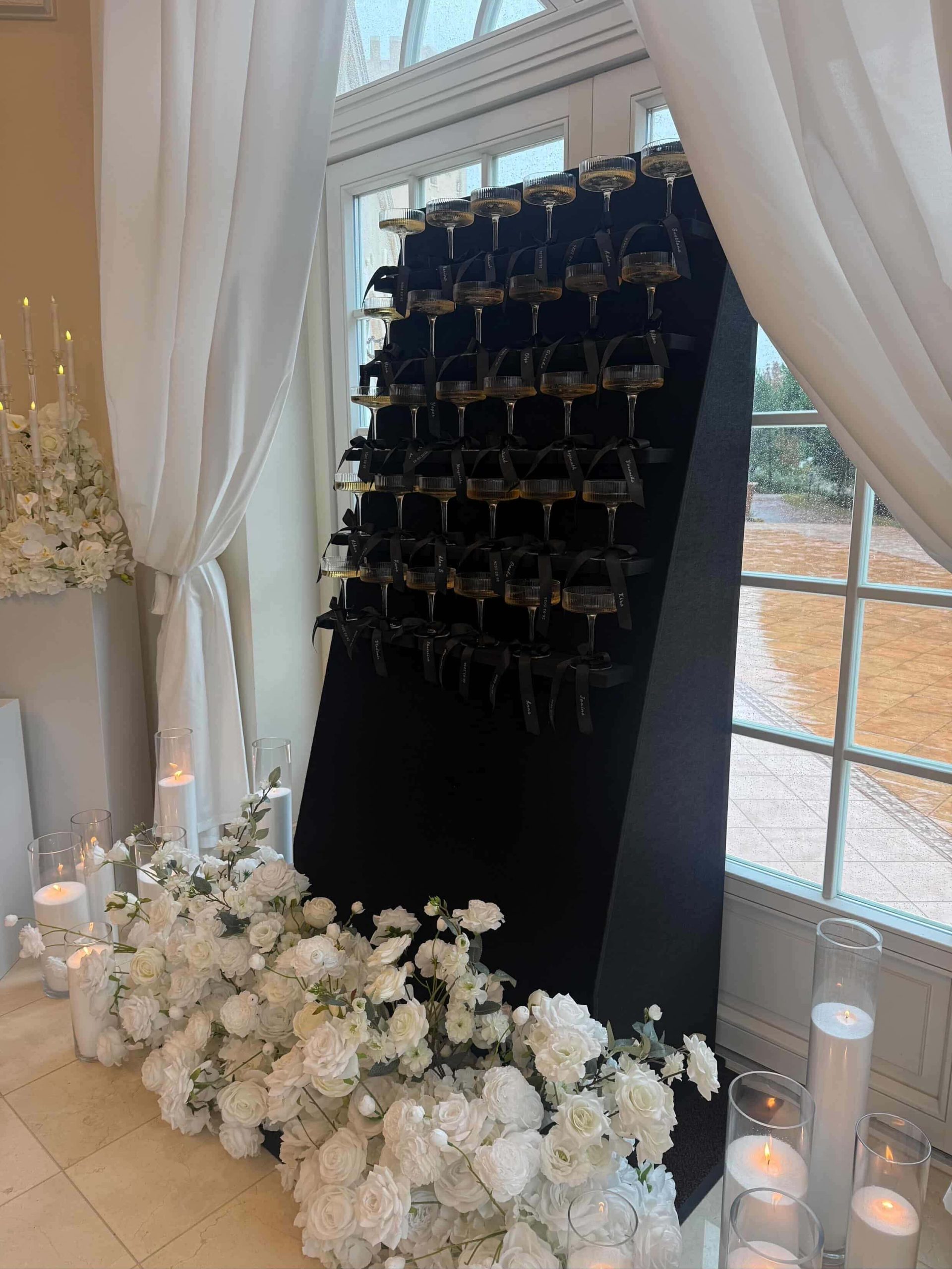 Designed to create a stunning visual moment, this black statement wall beautifully showcases up to 30 champagne glasses, styled in a sleek, elevated display. Each glass can either stand securely on the shelving or be inserted into specially designed holders, ensuring both style and practicality for service.