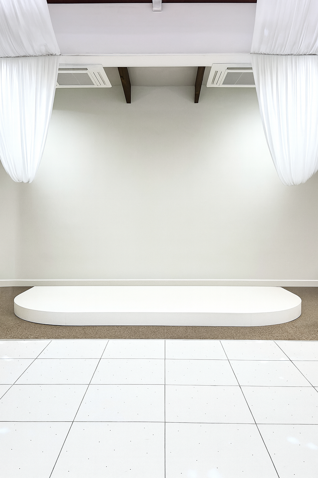 A sleek, semi-oval platform with a smooth white finish and a gently curved front edge. Its 4.8 m width comfortably frames a loveseat/sofa with two accent chairs, creating a refined focal point for ceremonies, sweetheart tables, and photo moments. The low, seamless profile keeps attention on your backdrop and florals while giving the setup a polished, elevated look.